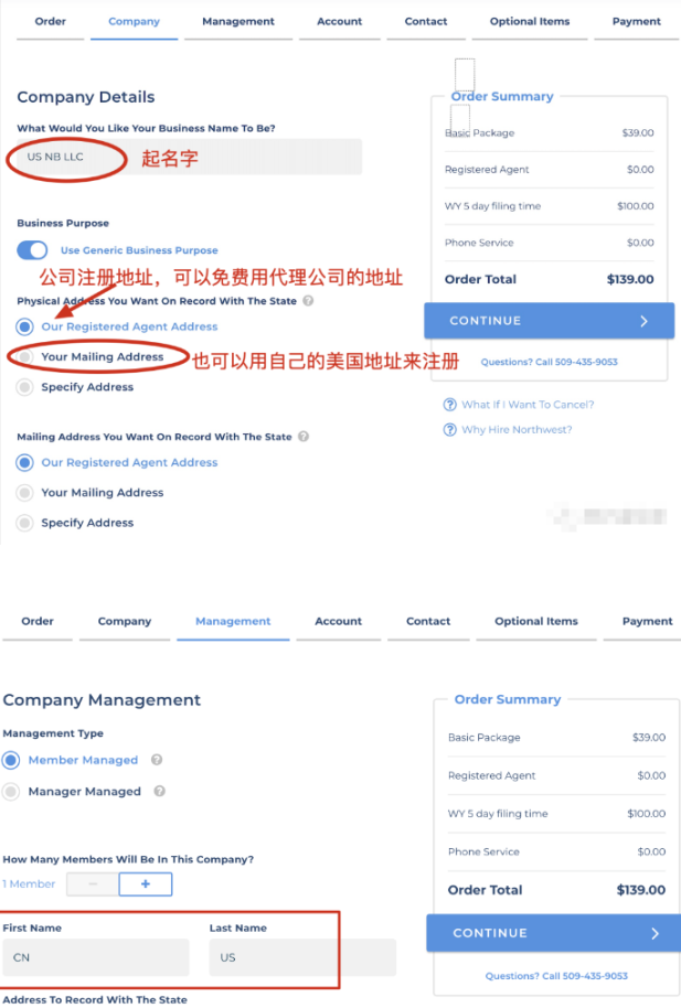 而通过NorthWest代理注册的方式,怀俄明州(wyoming) LLC公司注册139美元,这个说法不太准确,其中给州政府的100美元基础注册费时,还有额外的4美元信用卡服务费,所以总共应该是143美元。按照当前汇率,相当于人民币1000多元。并且某宝很多推荐的科罗拉州(Colorado),注册费用是1400元人民币左右,但是其state fee只需要50美元,加上Northwest的首年代理人费用39美元,总共只需要89美元,也就是人民币600多元。当然代注册要给服务费也正常,毕竟只要给钱就可以省掉自己摸索的麻烦,解决语言不通和一些弯路问题,因为NorthWest是一家美国的注册代理商,并没有中文服务。本文详细讲解下使用Northwest Registered Agent LLC 进行美国公司注册时,这143美元所包含的服务,以及其提供的其他附加付费服务。(当然如果实在不想折腾也可以找本司付费代办.可加微信:153589975)