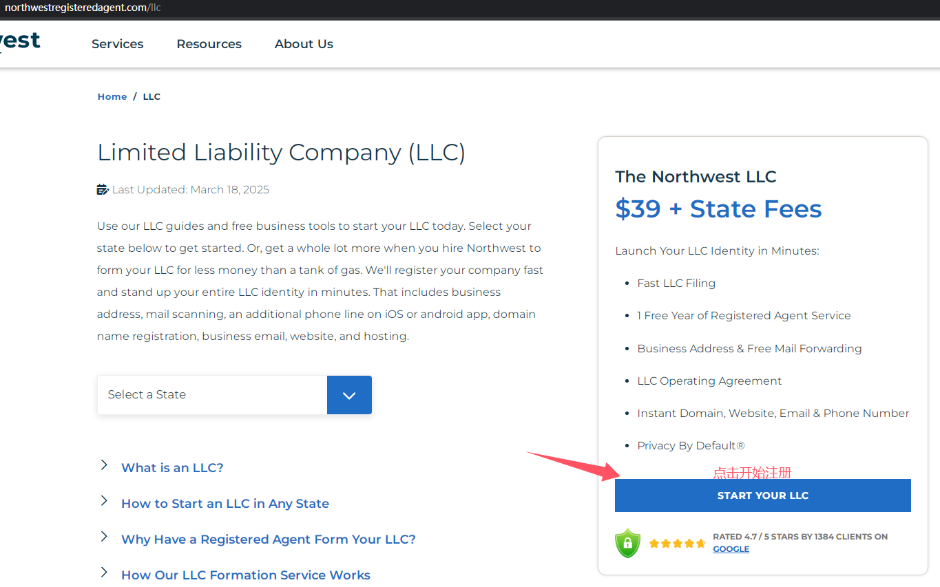 1.通过139美元申请链接,直达官网:northwestregisteredagent.com/llc