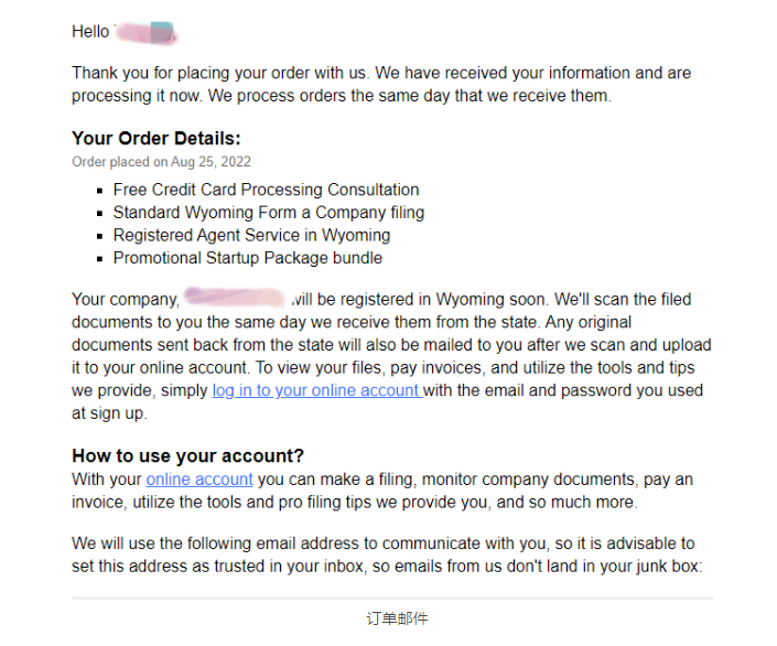 新成立美国公司的时候,每个州的规定不同,其注册费用也是不同的,比如怀俄明州是100美元,但是特拉华州是 110美元。给Northwest的39美元,包含Registered Agent 和 Filing Service Fee,也就是注册代理人费用和提交服务费。通过Northwest进行注册,公司的注册地址信息填写的就是Northwest提供的地址,不会公开自己的地址信息。并且,对于州政府和一些法律文件,Northwest也会给免费扫描并上传的,比如你自己申请EIN的话,可以用来接收政府的EIN确认函。同时,提供有限的商业邮件扫描服务,每年最多5份商业邮件的扫描。